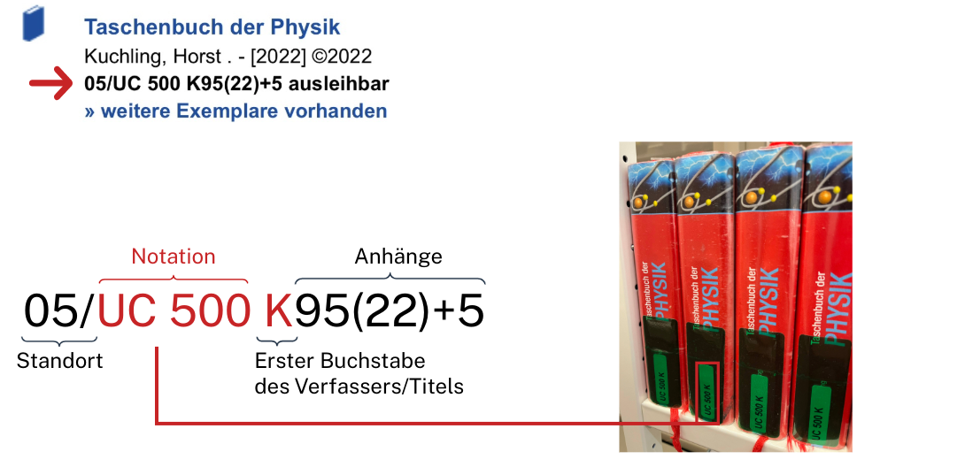 Im Online-Katalog (OPAC) erhält man die vollständige Signatur eines Buches. Diese zeigt, wo exakt ein Buch steht: