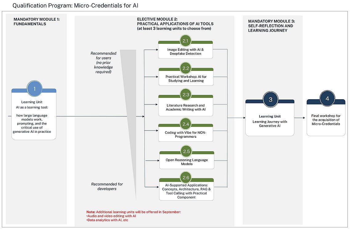 Whether you have no prior experience or already have programming skills, MC4genKI is designed for all students. You can choose individual courses according to your needs and interests or complete the full programme and earn a micro-credential - either way, join us.