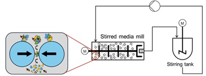 Abbildung 1: Schematische Darstellung der Rührwerkskugelmühle und der Zerkleinerung der Partikel