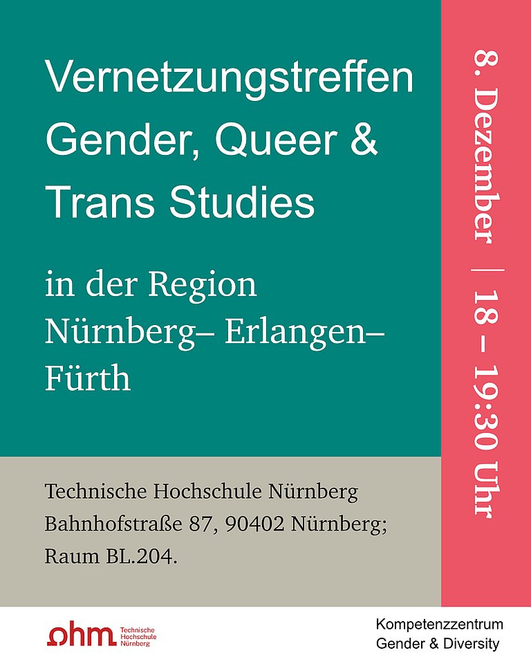 Das Kompetenzzentrum Gender & Diversity (KomGeDi) der Technischen Hochschule Nürnberg lädt herzlich zum Vernetzungstreffen für Wissenschaftler*innen im Bereich Gender, Queer und Trans Studies in der Region Nürnberg–Erlangen–Fürth ein.