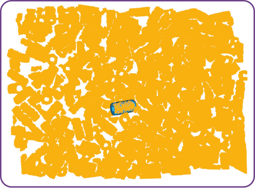 Innerhalb der aufgenommenen Punktwolke wird ein Bauteil anhand charakteristischer Merkmale erkannt und hervorgehoben. Durch den Abgleich mit den vorhandenen CAD-Daten kann die Lage und Orientierung des Objekts präzise bestimmt werden. Diese Informationen bilden die Grundlage für die Bahnplanung des Roboters, sodass ein gezielter Griff möglich wird.