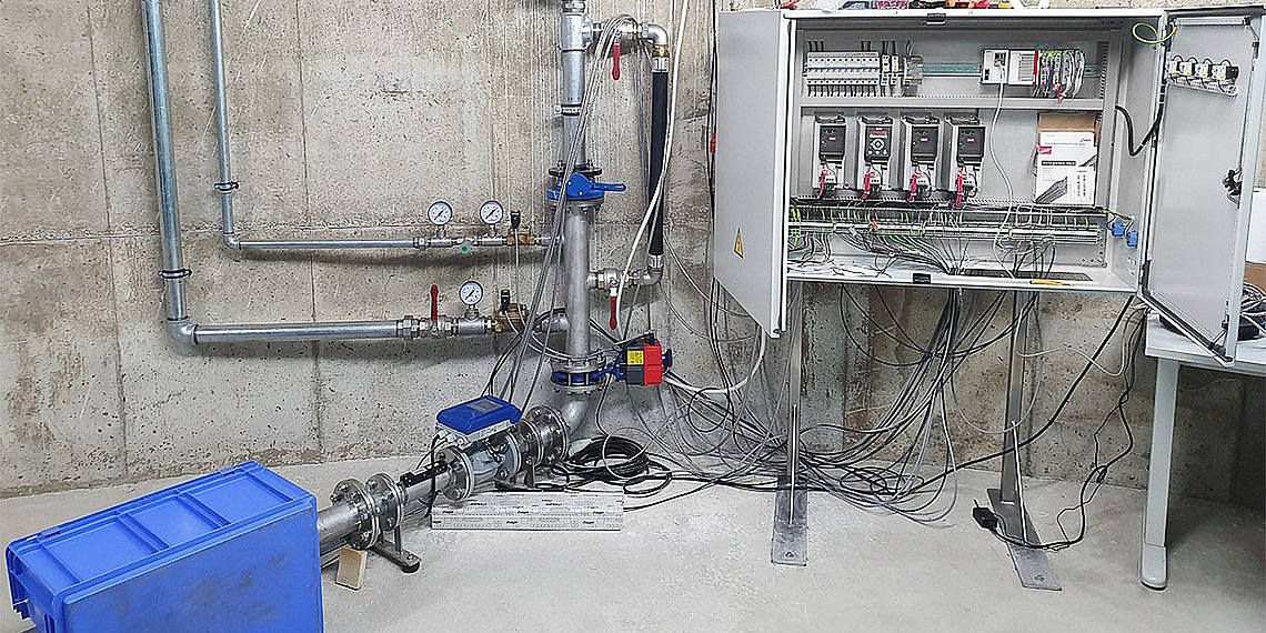 Die Firma SPECK Pumpen stellt speziell für dieses Projekt einen eigens entwickelten Versuchsstand auf ihrem Firmengelände zur Verfügung. Dieser Versuchsstand untergliedert sich in drei Grundbestandteile, einen 3000 l fassenden Wassertank, eine Druckerhöhungsanlage sowie ein 12 m hohes Rohrleitungssystem. Diese Rohrleitungsanlage repräsentiert hierbei ein beispielhaftes Mehrfamilienhaus mit verschiedenartigen ventilgesteuerten Abflüssen in unterschiedlichen Höhen, sodass gezielt Druckabfall im System real simuliert werden kann. Der Druckerhöhungsanlage kommt somit die Aufgabe des Ausgleichs des entstandenen Druckabfalls zu, indem basierend auf neuartigen Reglerstrukturen die Pumpen dieser Anlage so angesteuert werden, dass ein vorgegebener Solldruck möglichst gut gehalten wird.