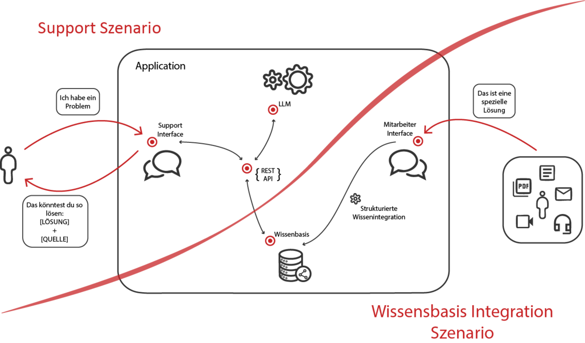 Die Abbildung stellt eine potenzielle Anwendungssituation dar. Das System wird mit verschiedenen Eingangsquellen gespeist – Wissenbasis Integration Szenario. Diese kann beispielsweise Anleitungen, Projektberichte oder andere Dokumentationen in Form von PDFs, Prozessdiagrammen sowie audio- und videobasierte Beschreibungen umfassen. Solche audio- oder videobasierten Quellen können mit einem Smartphone direkt von Mitarbeitern im Betrieb aufgenommen werden, um den Dokumentationsaufwand zu reduzieren. Zudem soll das System die Problematik mangelnder Eingangsdaten bei maschinellen Lernsystemen verringern. Innerhalb des Systems werden spezialisierte LLMs für jede Fachabteilung erstellt. Konkret werden Modelle existieren, die auf spezifische Anwendungen zugeschnitten sind, beispielsweise für die Finanz-, Qualitätssicherungs- sowie Forschungs- und Entwicklungsabteilung – Support Szenario.
