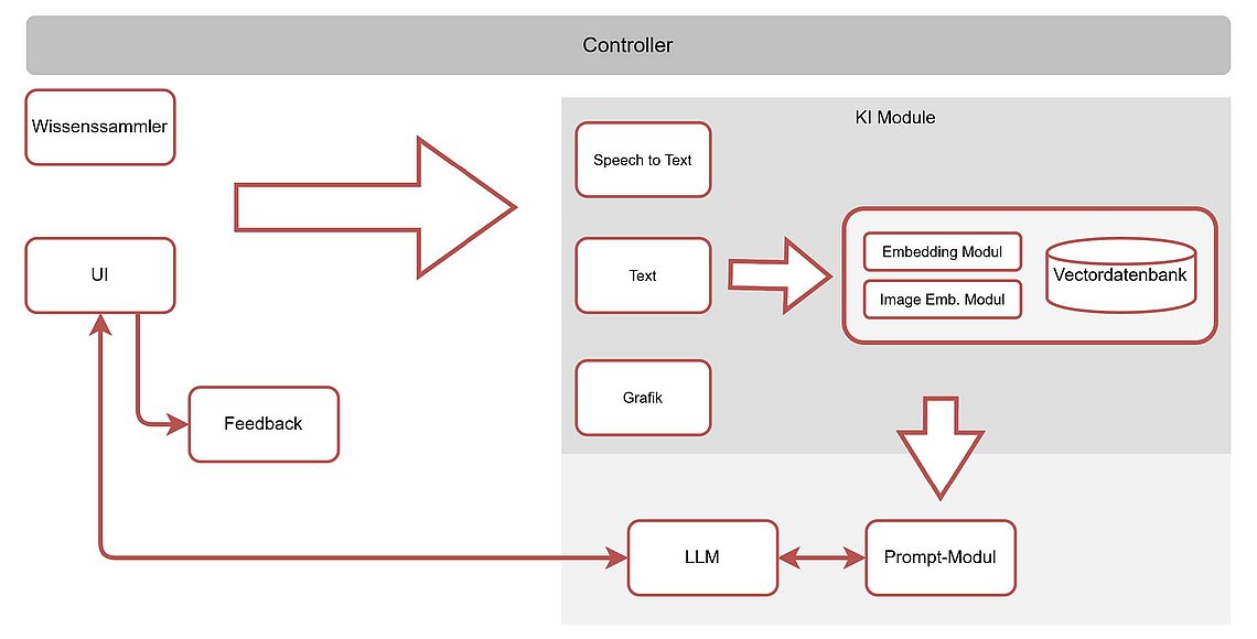 Die Systemarchitektur von KIHelpSys basiert auf einem modularen Aufbau mit einem zentralen Controller, der alle Komponenten koordiniert. Mitarbeitende interagieren uber eine Benutzeroberflache, die Eingaben und Feedback entgegennimmt. Informationen aus Text-, Audio- und Bildquellen werden durch spezialisierte KI-Module verarbeitet – darunter Speech-to-Text, Text- und Grafikverarbeitung sowie Embedding-Module zur Vektorisierung. Die erzeugten Vektoren werden in einer Vektordatenbank gespeichert und ¨uber ein Prompt-Modul an ein unternehmensspezifisches LLM weitergeleitet, das kontextbezogene Antworten generiert. So entsteht ein intelligentes, multimodales System zur effizienten Nutzung und Sicherung von Unternehmenswissen.