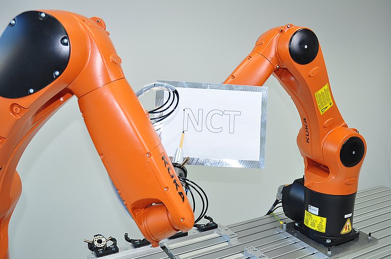 The Kuka iiwa is a collaborative robot which is versatile and also particularly adaptive. Initially, you can choose between three different operating modes and then programme the robot by simulation. Desired coordinates can also be approached by simply moving the robot by hand. Force and torque sensors record the environment in order to regulate speed and force in case of possible contact with humans. Due to its adaptability, two of these models are available at the NCT, on which several project papers, such as [insert link], have already been written.