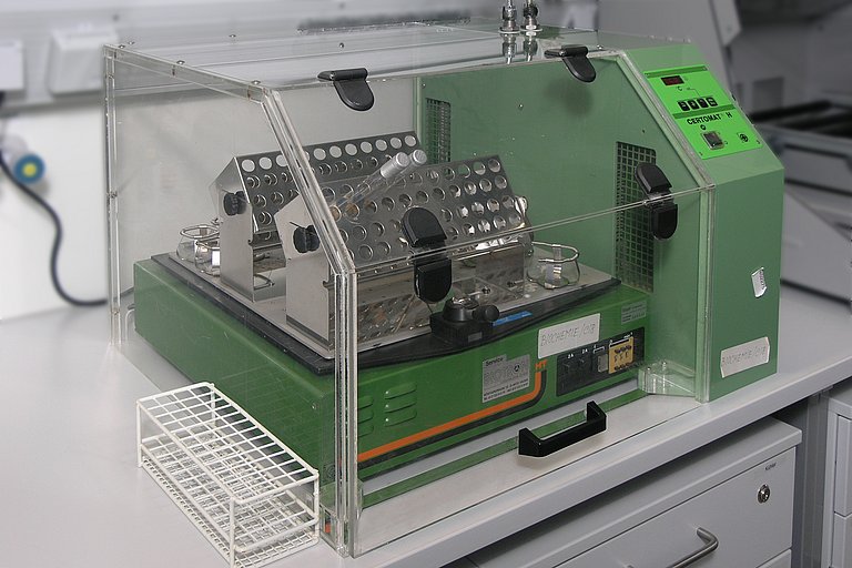 In the Biochemistry laboratory, a LightCycler device (Roche) is used for this purpose. Here, the reaction takes place in small glass capillaries and the fluorescence is measured by rotating the capillaries one after the other in front of an optical system.