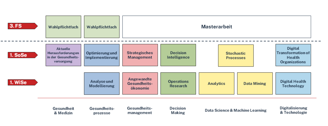 Themenbereiche der Module: Data Analytics (Fokus), Technologie und Digitalisierung, Management im Gesundheitswesen, Gesundheitswissenschaften. Siehe auch Studien- und Prüfungsordnung