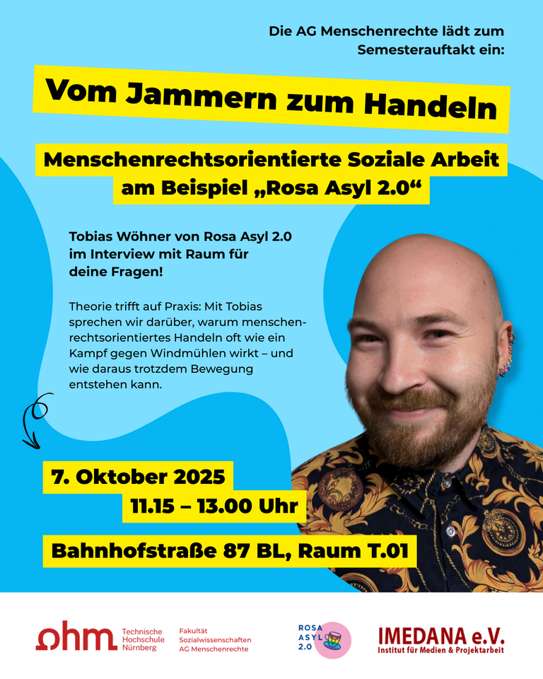 💡 Zum Start ins Wintersemester 2025/26 haben wir einen ehemaligen Kommilitonen und Sozialarbeiter aus Nürnberg eingeladen: Tobias Wöhner. Er arbeitet bei Rosa Asyl 2.0 (IMEDANA e.V.) mit LGBTQIA+*-Geflüchteten, die er im Asylverfahren berät und begleitet. Neben individueller Unterstützung und Beratung geht er noch weiter: