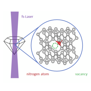 Coverbild zum Projekt "Femtosekundenlasersystem zur Erzeugung von Mikro- und Nanostrukturen für optische Quantentechnologien" (Schaubild welches den fs-Laser, Fehlstellen(Vacancy) und einen Diamanten zeigt)