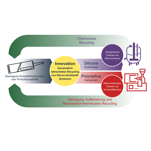 Deutschland als rohstoffarmes Land, aber mit stetig steigender Nachfrage an Ressourcen für die hiesige Industrie, muss dieser Herausforderung strategisch und technologisch begegnen. Das Vorhaben CeReSiS dient dem übergeordneten Ziel, einen signifikanten Beitrag zur Abfallverminderung durch Wiedergewinnung wertvoller Sekundärrohstoffe in der Polymer-produzierenden und -verarbeitenden Industrie zu leisten. So sollen Ressourcen langfristig im Sinne einer ökologischen Nachhaltigkeit geschont und der Weg zu einer Green Economy mitbereitet werden. Im Vorhaben sollen das Recycling-Potential von teilweise oder vollständig vernetzten Silicon-Dichtstoff-Systemen inklusive des Verpackungsmaterials (Polyolefine) untersucht und geeignete Verfahren entwickelt werden. Folgende Projektziele stehen im Rahmen des Vorhabens im Fokus: Die nach aktuellem Stand technisch nicht wiederverwertbaren teils oder vollständig vernetzten End-of-Life Silicon-Dichtstoffmassen sollen kontrolliert und energieeffizient wieder in die molekularen Bausteine zerlegt werden können, um als hochwertige Sekundärrohstoffe erneut den Weg in den Prozess der Silicon-Herstellung oder anderer Si-haltiger Materialien zu finden. Die zur Verpackung der Dichtmassen in Kartuschen verwendeten Kunststoffe (insb. PE, PP) können nach aktuellem Stand nach in Kontaktbringung mit Siliconen nur thermisch verwertet oder deponiert werden. Eine Reinigung der Kartuschen und die Gewinnung hochwertiger Regranulate ist bisher nicht umgesetzt. Somit sollen im Vorhaben CeReSiS Verfahren entwickelt werden, um die in den Kartuschen eingesetzten Polyolefine als hochwertige Sekundärrohstoffe zurückzugewinnen und zu einem möglichst hohen Anteil in Produkten (im Idealfall neuen Kartuschen) in den Materialkreislauf zurückzuführen. Durch Kombination der beiden Projektziele wird somit ein ganzheitlicher Ansatz zum Recycling gebrauchter oder überlagerter Silicon- Dichtstoffkartuschen als Systemlösung für die betreffenden Industrien verfolgt.