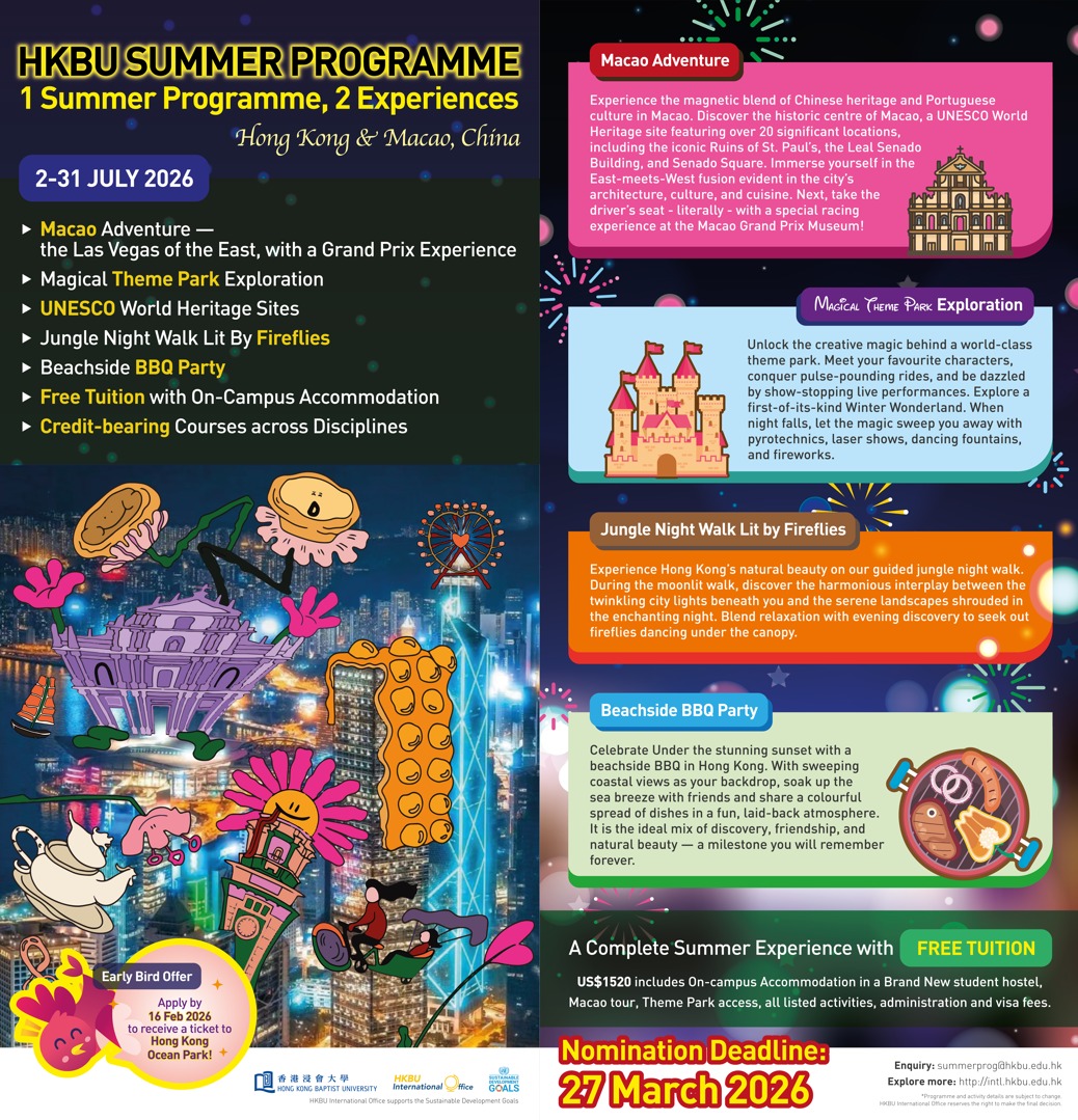 Please nominate your students on or before 27 March 2026 via the link below: HERE. Upon nomination, your students will then receive detailed application instructions from HKBU by email. The application deadline for them is 10 April 2026. We’d greatly appreciate it if you could please help us promote this amazing programme to your students and share our e-Poster (attached) with them.