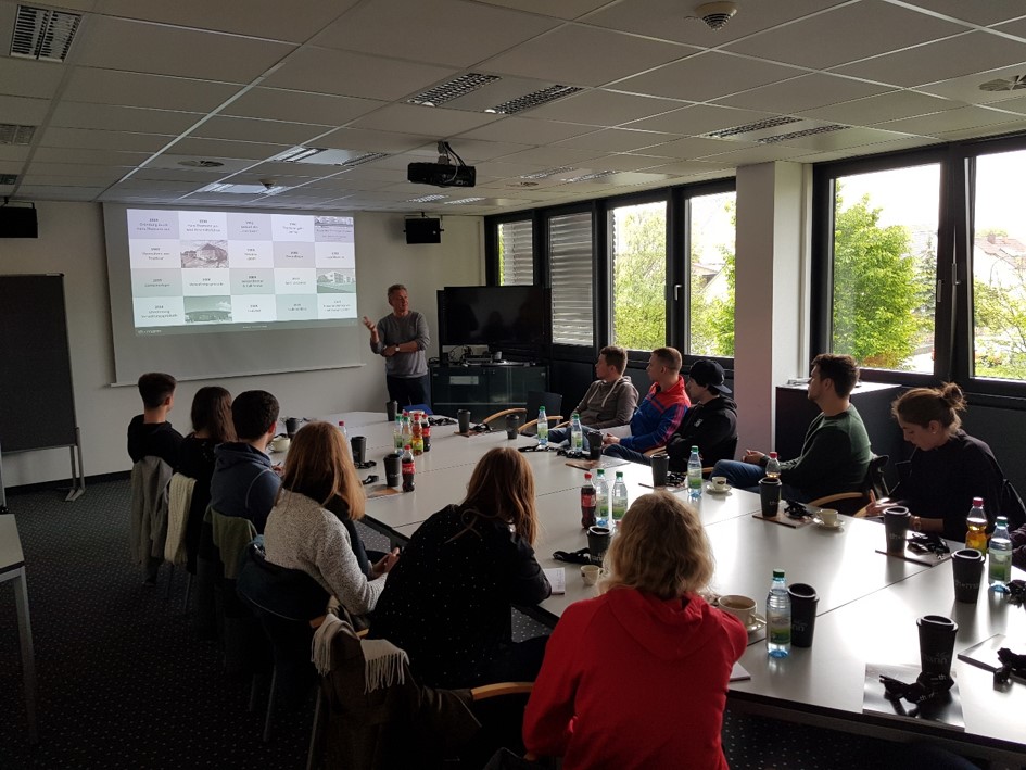 Die Exkursion begann mit einem Vortrag von Hans Thomann über die Entwicklungen des Musikgeschäftes, Kundenerwartungen, Produktbesonderheiten und die Strategie bzw. Rolle der Logistik für das Musikhaus Thomann. Er ging auf die umfangreichen Investitionen in die Logistikabwicklung ein, die u.a. automatisierte Hochregallager, Shuttle-Lager, Schmalganglager sowie ein neues Versandcenter mit automatischen Verpackungsanlagen umfasst.