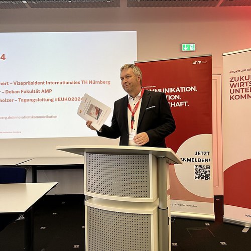 Die Tagung EUKO 2024 stellte die interdisziplinäre und interkulturelle Betrachtung dieser kommunikativen Repräsentationen von Zukunft in der Wirtschaftskommunikation in den Mittelpunkt. Gastgeber war der Fachbereich Technikjournalismus und Innovationskommunikation der Fakultät AMP der Ohm; zu den Unterstützern der Konferenz zählten die Siemens AG, die „VDI nachrichten“ sowie die Community 1E9.
