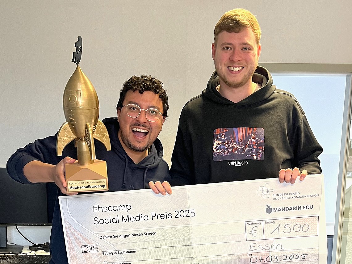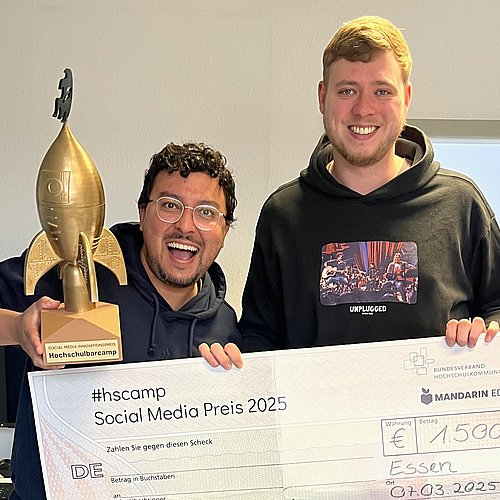 Das Social Media Team der Ohm, bestehend aus Macgyver Corrêa Felix und Mario Kraußer, belegte den ersten Platz beim Social Media Innovationspreis 2025 des Bundesverbands für Hochschulkommunikation.