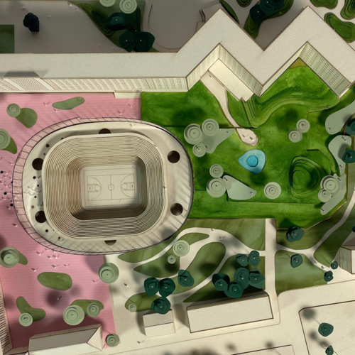 An der Arbeit der Nürnberger Studierenden „KOEXISTENZ - KONTRASTE IM EINKLANG“ schätzte die Jury besonders die Idee, Ankunftssebene und Zuschauerränge der Halle als Teil einer geländeübergreifenden Topografie zu betrachten, die sich vom urbanen Vorplatz zu einem naturnahen, scheinbar biotophaften Grünraum hin entwickelt. Die Preisrichter konstatierten: Dieser Beitrag inspiriert rege Diskussionen und verdient eine besondere Anerkennung.
