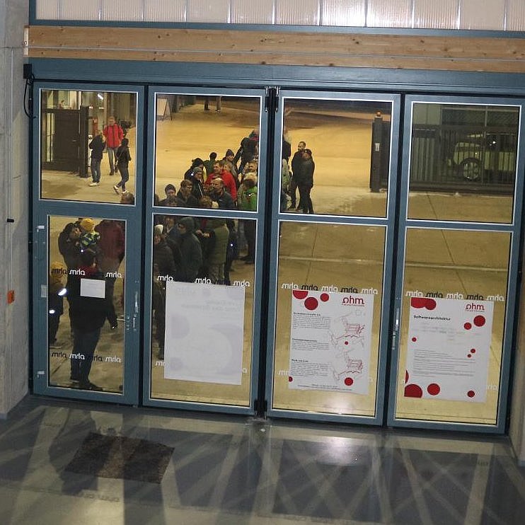 Ab 18:00 Uhr alle 30 Minuten bis 23:30 Uhr stellten Dipl.-Ing. Thomas Ulrich und Matthias Spiegel die IT-Projekte von Studierenden der Informatik und Medieninformatik zum Tanz der Drohnen in der neuen Drohnenhalle auf OIC vor.