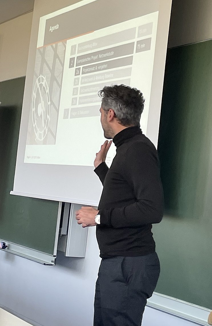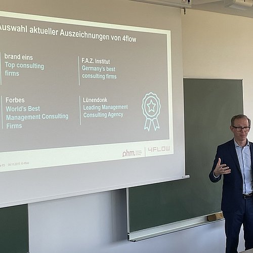 Am 4.11.2025 begrüßte Prof. Dr. Christoph Tripp, Professor für Distributions- und Handelslogistik in der Fakultät Betriebswirtschaft der TH Nürnberg, in seiner Mastervorlesung „Distribution & Handelslogistik“ zwei hochkarätige Gäste: Matthias Moch, Vice President Consumer Goods, und Finn von Hammerstein, Partner und Leiter des Münchener Büros der 4flow SE. Vor rund 25 Masterstudierenden der Spezialisierung „Logistik, Einkauf und Supply Chain Management“ sowie zahlreichen Bachelorstudierenden aus dem Schwerpunkt „Einkauf & Distribution“ präsentierten die Experten ein spannendes Projektbeispiel zur Netzwerkoptimierung eines Großhändlers.