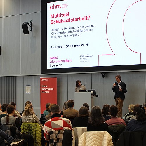 Lars Bieringer und Prof. Dr. Sebastian Rahn von der Hochschule für Technik und Wirtschaft des Saarlandes stellten eine umfangreiche quantitative Studie über das Arbeitsfeld Schulsozialarbeit vor. Prof. Dr. Jutta Harrer-Amersdorffer und Prof. Dr. Johannes Kloha von der Ohm rahmten den Tag mit Präsentationen zur Lehrforschung als wichtigem Element der akademischen Ausbildung von Studierenden und zum Forschungsprojekt "KISCOM: Kinderschutz an Schulen - Collaborative Management”. Studierende beider Hochschulen beteiligten sich an Posterpräsentationen.