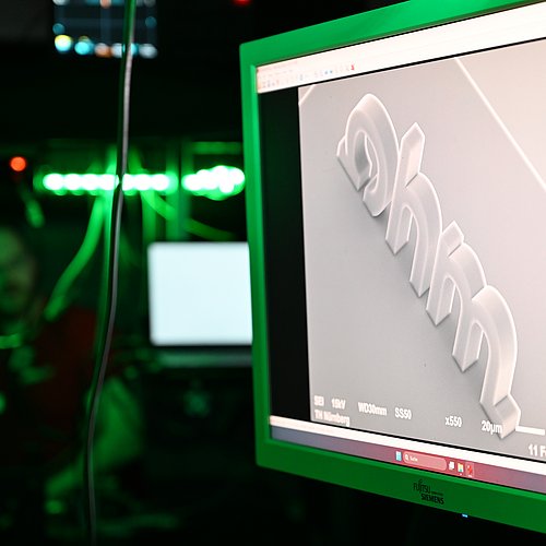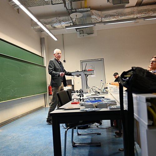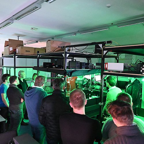 Wie die Fertigung von Mikro-Optiken tatsächlich vonstattengeht, konnten die Besucherinnen und Besucher nach der theoretischen Einführung anschließend bei Laborführungen selbst aus nächster Nähe begutachten. Im Labor für Optische Quantentechnologien war eindrucksvoll zu sehen, wieviele Laser, Kabel, Linsen, Strahlteiler und andere spezialisierte optische Komponenten eines Versuchsaufbaus in einem kompakten Bauteil Platz finden müssen.