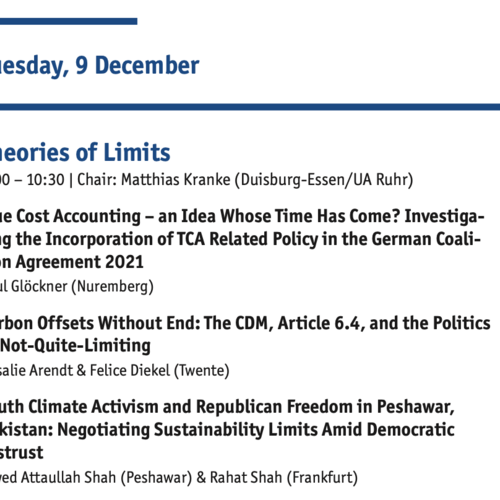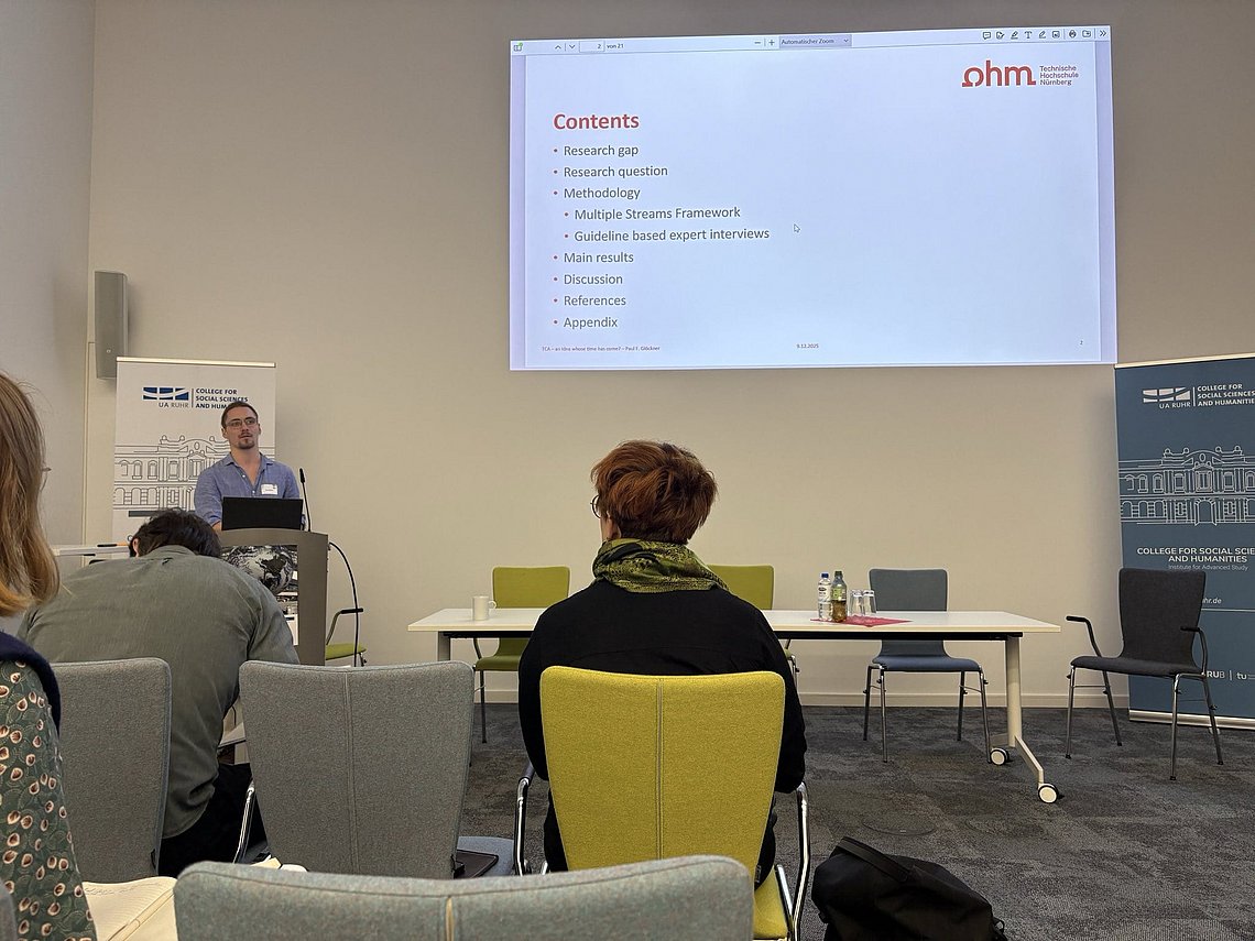 Paul Glöckner (studentische Hilfskraft bei Prof. Gaugler, Fakultät BW) hatte am 09.12.2025 die Möglichkeit seine aktuelle Forschungsarbeit mit dem Titel „True Cost Accounting (TCA) - eine Idee, deren Zeit gekommen ist?“ auf der Konferenz „The Politics of Limits: Sustainability and Democracy in Times of Changing Climates“ an der Universität Duisburg-Essen vorzustellen.
