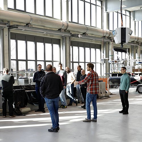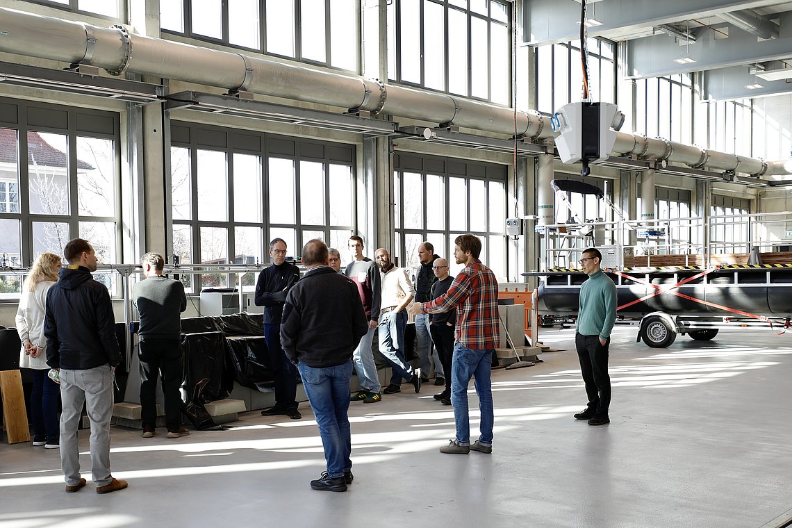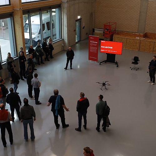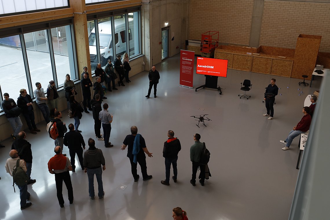 Nach einer einführenden Vorstellung des Gebäudes erhielten die Teilnehmenden im Rahmen eines Rundgangs Einblicke in das Wasserbaulabor, das Labor für Sustainable Materials & AI for Engineering sowie die neuen LEO Labs. Darüber hinaus informierten sie sich eingehend über die Gebäudetechnik und das Energieversorgungssystem des OIC. Im Anschluss stellte Prof. Dr. Christian Pfitzner das Labor für mobile Robotik vor und begeisterte die Teilnehmer mit einer Drohnenvorführung im AerodrOhm.