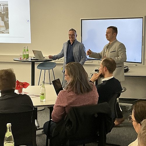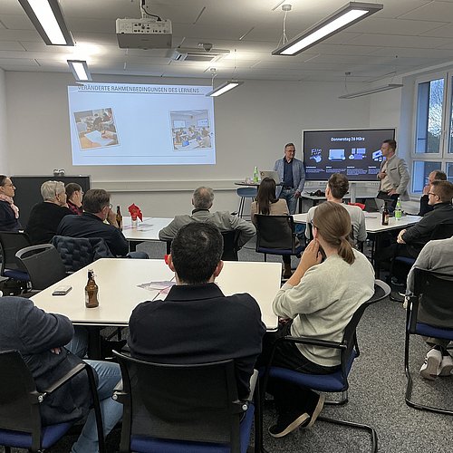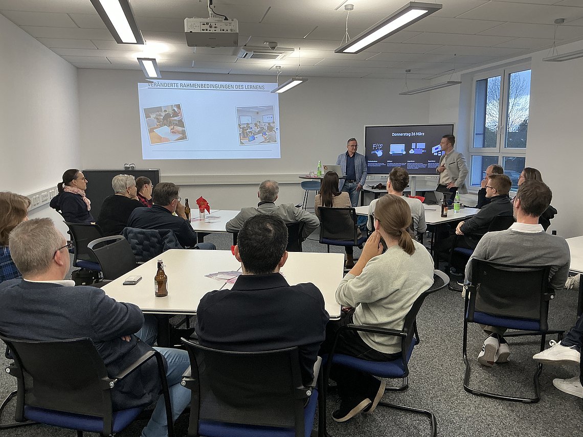 Die Referenten Florian Brückner (Stiftung Bildungspakt Bayern) und Oliver Neupert (Lorenz-Keim-Schule, Berufliches Schulzentrum Kronach) gaben eindrucksvolle Einblicke in die aktuellen Entwicklungen rund um KI‑gestützte Lernprozesse, hybride Lernlandschaften und neue didaktische Möglichkeiten. Schon zu Beginn wurde klar: Die Rahmenbedingungen des Lernens verändern sich rasant. Internationale Klassen, heterogene Sprachniveaus, digitale Plattformarbeit sowie die Verschmelzung von Lern‑ und Arbeitsorten stellen Schulen vor neue Herausforderungen. „Unterschiedliche Nationalitäten mit unterschiedlichen Sprachen und Sprachniveaus im Unterricht sind eine riesige Herausforderung für Lehrkräfte.“, so Florian Brückner. Doch KI eröffnet hier neue Wege: „Die Übersetzungsqualität mit KI ist inzwischen wirklich sehr gut“, erläuterte Neupert.