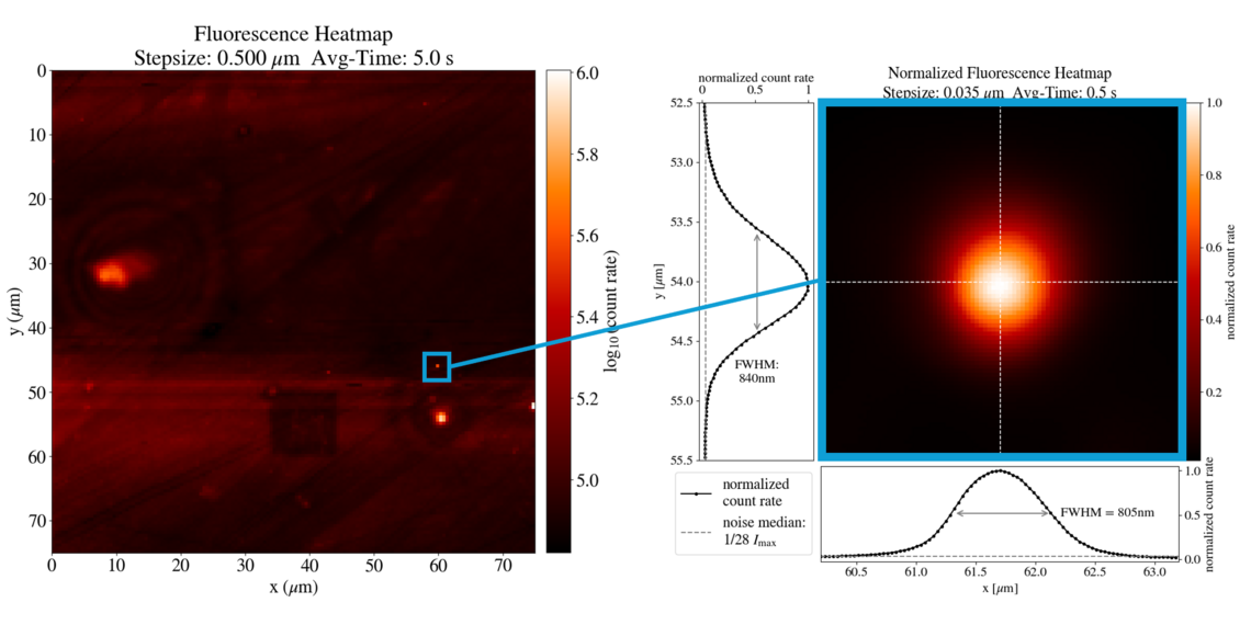• Measurement of an individual Nitrogen-Vacancy in diamond at our homebuild confocal scanning microscope. The Inset shows a high resolution scan of one vacancy center with a pixel to pixel resolution of 35nm