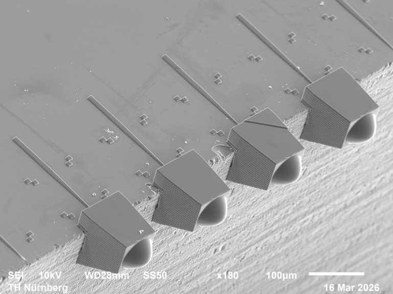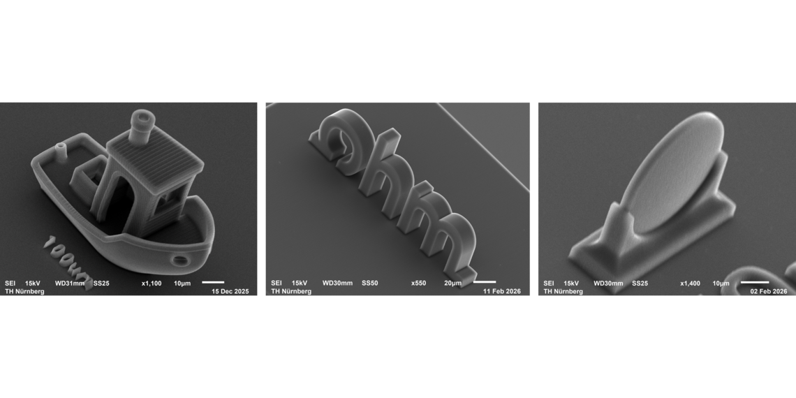 • Scanning electron Microscope Images of 3D micro-elements printed via two photon polymerization in our clean room facility. Left: Benchmark test of the well known "Benchy" famous in 3D-Printing Middle: Standing, three dimensional Ohm logo Right: Functional microscale standing biconvex lens