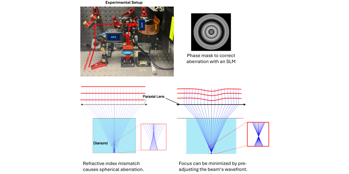 • A Spatial-Light-Modulator (SLM) can be used to alter the wavefront of light. Here it is used to compensate aberrations at the diamond-air interface for the purpose of generating NV-Centers in diamond with a femtosecond laser