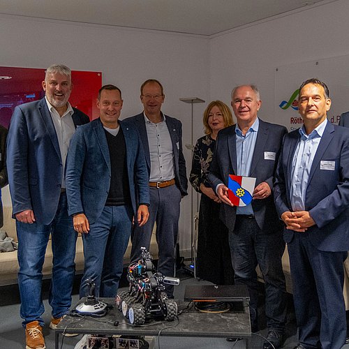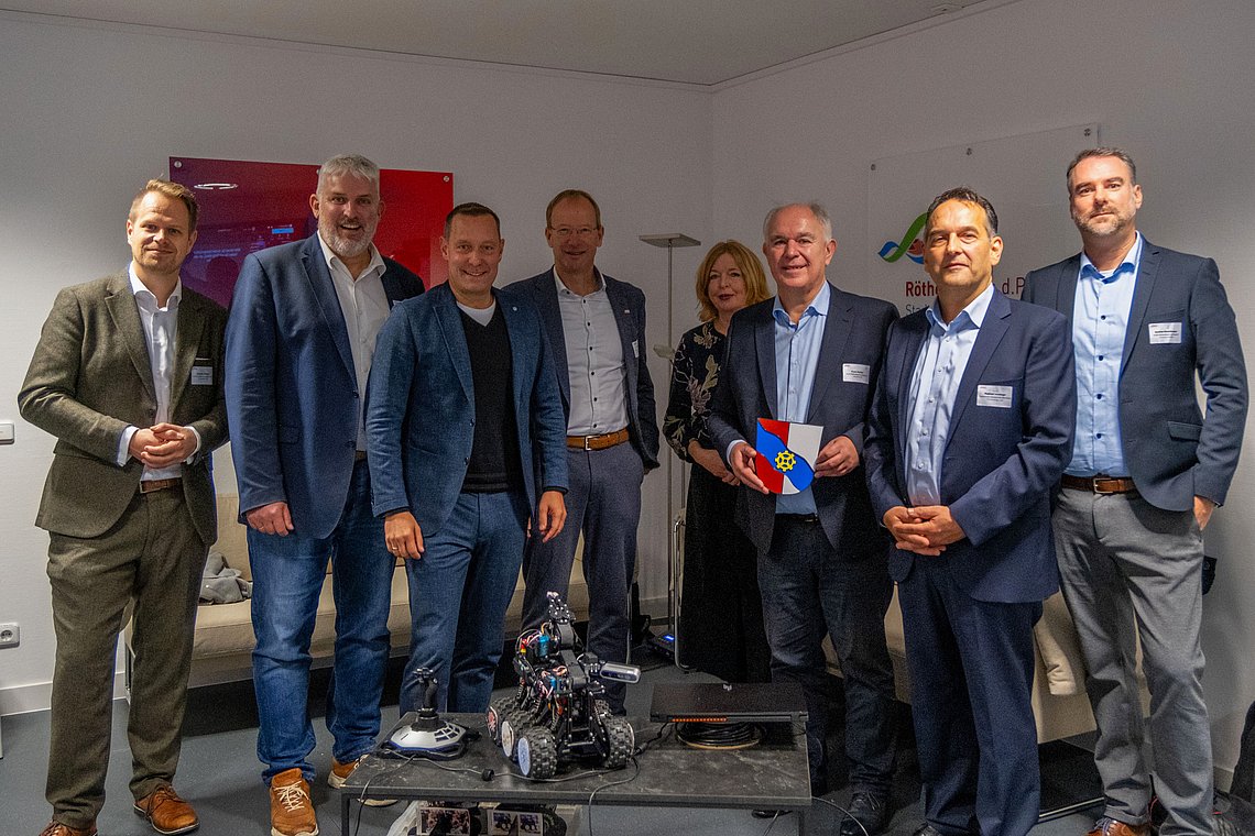 Bildinformation „25-10-27_Ohm_Makerspace_2.jpg“: Eröffneten gemeinsam den Makerspace in Röthenbach an der Pegnitz (von links): TTZ-Leiter Prof. Dr. Christian Pfitzner, der Laufer Bürgermeister Thomas Lang, der Landrat des Landkreises Nürnberger Land, Armin Kroder, Ohm-Vizepräsident Prof. Dr. Tilman Botsch, Makerspace-Koordinatorin Prof. Dr. Sabine Fromm, der Bürgermeister von Röthenbach an der Pegnitz, Klaus Hacker, Makerspace-Koordinator Prof. Dr. Raphael Verstege und Bastian Streitberger, Wirtschaftsreferent der Stadt Röthenbach. (Foto: Mario Kraußer)