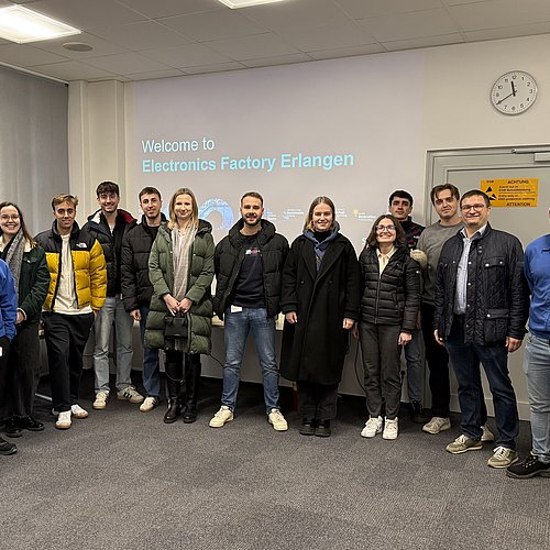 Bereits im vorherigen Semester hatte derselbe Studierende im Rahmen eines ausführlichen Vortrags zentrale Inhalte zur E-Kanban-Lösung sowie zu den Materialfluss- und Logistikprozessen bei Siemens Motion Control vorgestellt. An diese theoretischen Grundlagen konnte nun angeknüpft werden, indem die Themen gemeinsam mit der Studiengruppe direkt im realen Produktionsumfeld vertieft wurden.