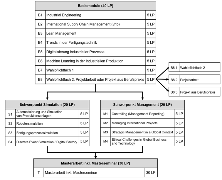 Im Schwerpunkt „Simulation“ werden Methoden zur virtuellen Absicherung von Abläufen, Prozessen und Strukturen in Produktion und Logistik vertieft. Der Schwerpunkt „Management“ behandelt betriebswirtschaftliche Fragestellungen der Überwachung und Steuerung operativer Prozesse und der strategischen Unternehmensentwicklung.