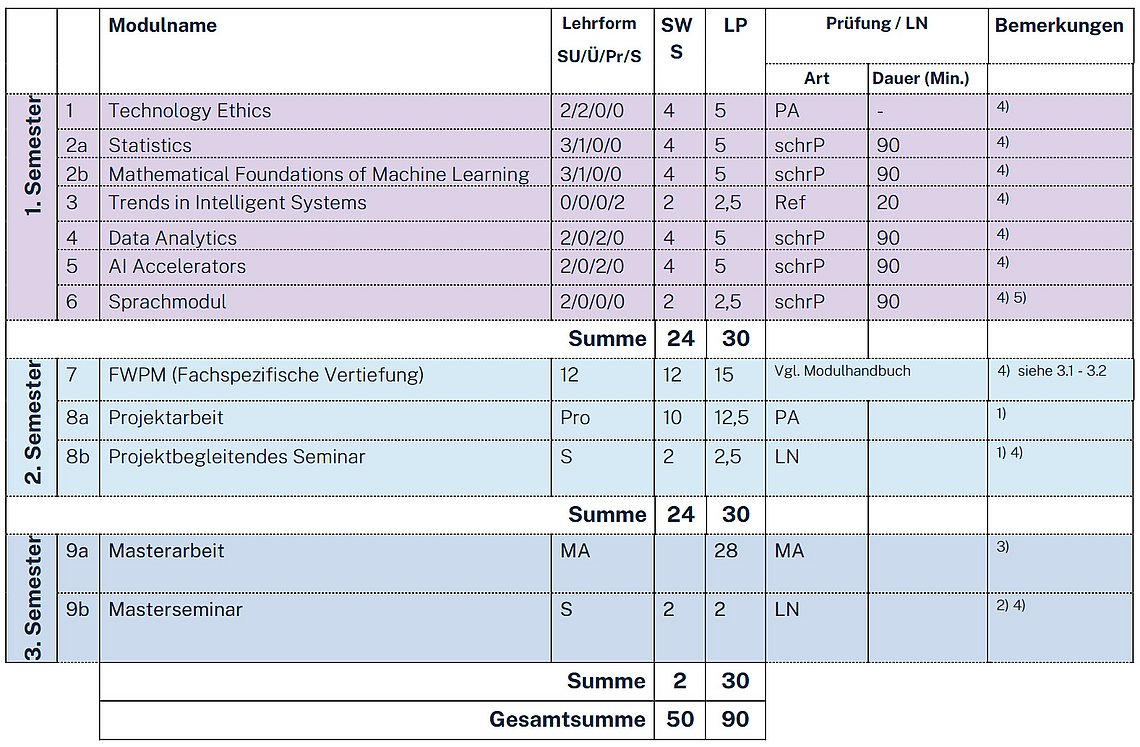 Der Masterstudiengang Intelligent & Autonomous Systems ist auf 3 Semester Regelstudienzeit angelegt. Im ersten Semester werden relevante Kenntnisse u.a. zu den Themen Machine Learning, Data Science und Mathematik wiederholt und vertieft. Im zweiten Semester wählen Studierende drei Vertiefungsmodule und arbeiten in einem praxisnahen Projekt. Im dritten Semester erfolgt die Anfertigung der Masterarbeit.